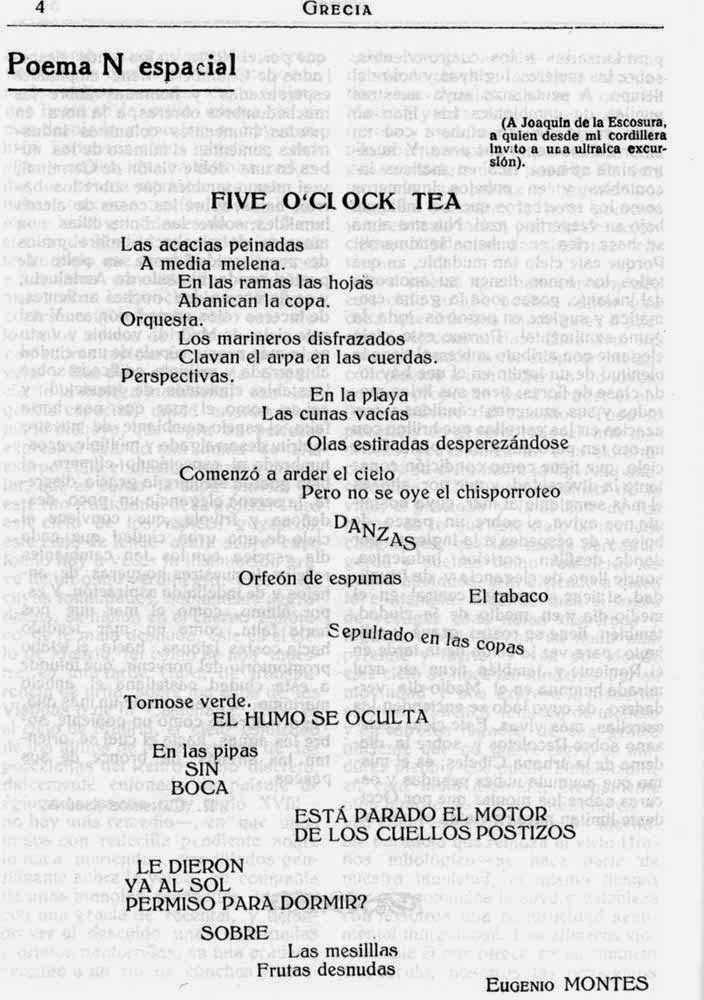 Personificación de la guitarra. Suma de elementos inconexos: "reloj de pulsera", "cabra sumergida", "paloma que no vuela", "bigote del suicida". Ahora bien, podemos hacer asociaciones: la guitarra, el reloj y el bigote son objetos personales; la cabra y la paloma son animales; sumergida, no vuela y suicida son rasgos negativos o de muerte.